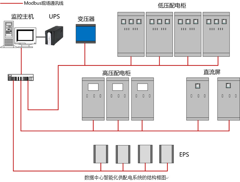 配電室中通常設(shè)置兩臺(tái)變壓器、不間斷電源EPS、UPS、直流屏和高、低壓配電柜若干面。通常在配電柜上配置電力儀表進(jìn)行終端數(shù)據(jù)采集。