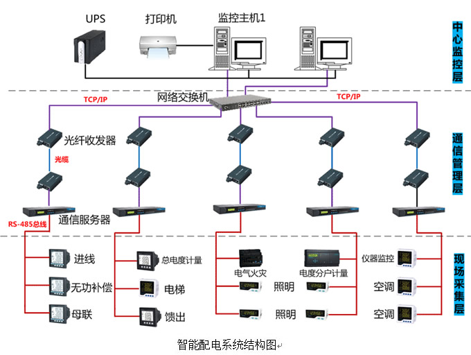 智能化供配電系統(tǒng)從結(jié)構(gòu)來(lái)看都可分為三層:現(xiàn)場(chǎng)I/O、通訊管理層和中心控制層。其中,控制層是整個(gè)系統(tǒng)的控制核心,監(jiān)測(cè)和控制供電系統(tǒng)的運(yùn)行,同時(shí)也可用于人-機(jī)對(duì)話的界面、數(shù)據(jù)處理和存儲(chǔ)管理;現(xiàn)場(chǎng)I/O則用于現(xiàn)場(chǎng)設(shè)備狀態(tài)信號(hào)和運(yùn)行參數(shù)的采集,對(duì)現(xiàn)場(chǎng)設(shè)備進(jìn)行控制操作。